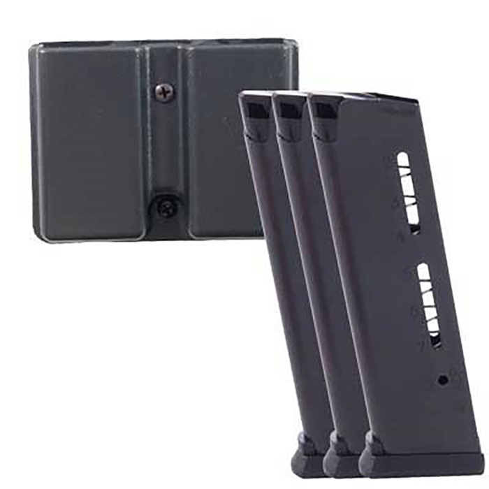 Magazynek .45 ACP pasuje do modelu Gov’t; pojemność 8 nabojów; numery licznika wytłoczone na obudowie obok otworów świadków. Dostępne w naturalnym wykończeniu srebrnym lub czarnym tlenku w pojedynczych sztukach lub w wygodnych, oszczędnych zestawach 3-Pak z lub bez podwójnej torby Michael’s of Oregon z wytrzymałego, odpornego na uderzenia polimeru Kydex®.