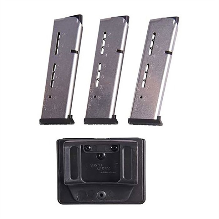 .45 ACP pasuje do modelu Gov’t; pojemność 8 nabojów; liczby na korpusie obok otworów świadków. Dostępne w naturalnym wykończeniu srebrnym lub czarnym tlenku w pojedynczych sztukach lub w wygodnych, oszczędnych pakietach 3-sztukowych z lub bez podwójnego pokrowca Michael’s of Oregon z wytrzymałego, odpornego na uderzenia polimeru Kydex®.