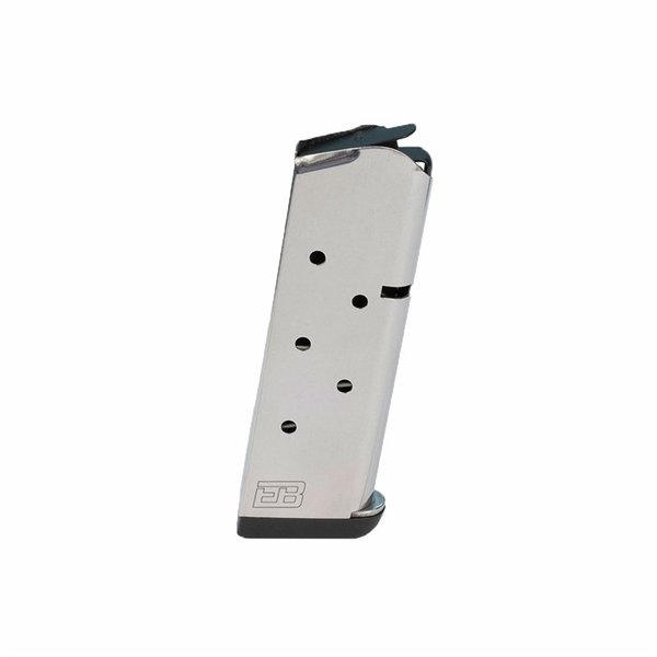 Ed Brown's Officer's Model 1911 magazines are built to be as robust and reliable as the 1911 pistol itself. The mag body of corrosion-resistant stainless steel is heat-treat hardened to Rc 35 for exceptional strength. The seam is neatly TIG welded, and the body is carefully polished inside and out, so there's nothing to snag on the magwell OR the rounds in the mag. The feed lips are engineered for reliable feeding of traditional ball ammo, as well as hollowpoints and target rounds. Officer's Model 1911 magazines from Ed Brown have a welded-on steel base plate to minimize bulk on a concealed carry pistol. And each mag comes with a pair of screw-on rubber base pads - a thin pad to protect that mag when ejecting it on hard ground and a thicker pad for added length for easy insertion into and removal from a pistol fitted with an extended magwell. Models for .45 ACP (7-Rd) and 9mm Luger (8-Rd) pistols Sturdy 410 stainless steel body / welded-on base plate Available with natural Silver finish or non-reflective Black Nitride for extra corrosion protection Witness holes for easy monitoring of load status High tensile strength spring ensures reliable feeding & lock back of slide on last round 2 rubber base pads included with each mag All of these high-end features would give little benefit if these mags had a cheap plastic follower. Instead, Officer's Model 1911 magazines comes with a unique-design follower made from hardened STEEL (just like the mag body). The extended front skirt and anti-friction finish keep the round stack moving smoothly for reliable feeding AND full engagement of the slide stop after the last round. The Ed Brown crew has been manufacturing custom 1911s for over half a century. When it comes to extracting the full performance potential from your Officer's Model 1911, their magazines deliver!