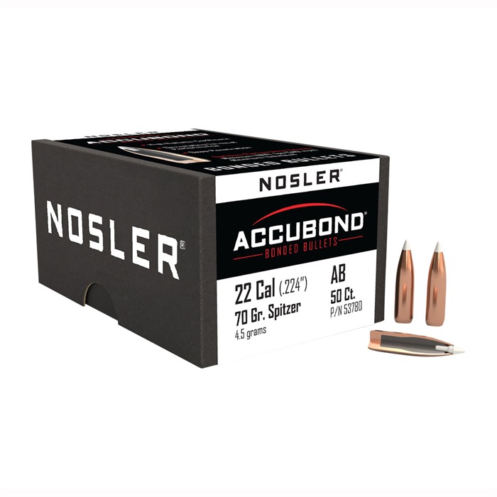 Nosler Accubond 22 caliber 70-grain spitzer bullets are built with a proprietary bonding process that eliminates voids in the bullet core. AccuBond marries Nosler's traditional copper alloy jacket with its special lead alloy core. Brand Style: Accubond Bullet Style: Spitzer Caliber: 22 Bullet Diameter: 0.224" Bullet Weight: 70 50 count box. The polymer tip improves accuracy and ballistic performance. The result is a hunting bullet that flies true, penetrates deep, retains its weight and won't cause extensive fouling.