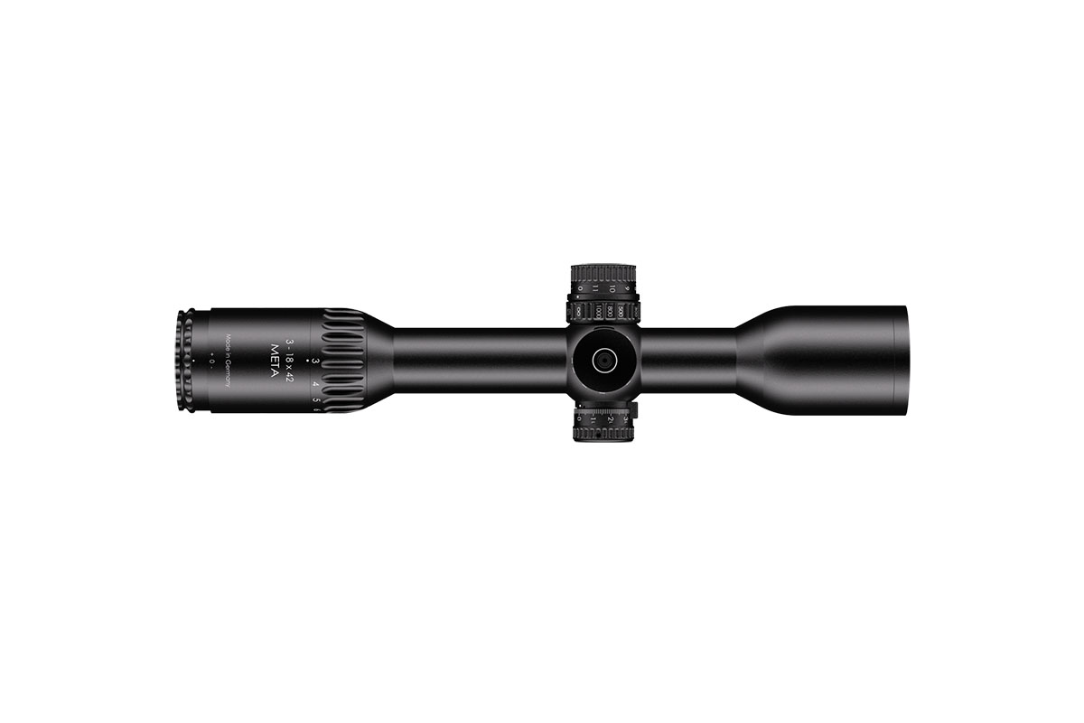 4060537066456 The 3-18x42 Meta combines exceptional optical clarity with powerful performance, delivering a premium shooting experience for both hunters and precision marksmen. Its wide field of view, paired with the LP7 reticle featuring an illuminated red dot, provides superior situational awareness and lightning-fast target acquisition. Unmatched precision is achieved through patented Zero Deviation Technology, a parallax adjustment starting from 20 m, and a generous internal adjustment range, ensuring consistent accuracy even at long distances. For enhanced mounting flexibility, the 3-18x42 Meta features the innovative “LPI” system – an illumination control integrated into the parallax adjustment turret. This smart design improves ergonomics and handling, offering smooth operation for both right- and left-handed shooters. The slim, streamlined construction of the scope makes it perfectly compatible with clip-on devices, while the reinforced ocular ring allows secure attachment of dust covers or add-on optics. With its blend of cutting-edge technology, robust build quality, and refined usability, the 3-18x42 Meta stands as a true symbol of precision engineering — designed to deliver reliability, adaptability, and clarity in every shooting scenario.