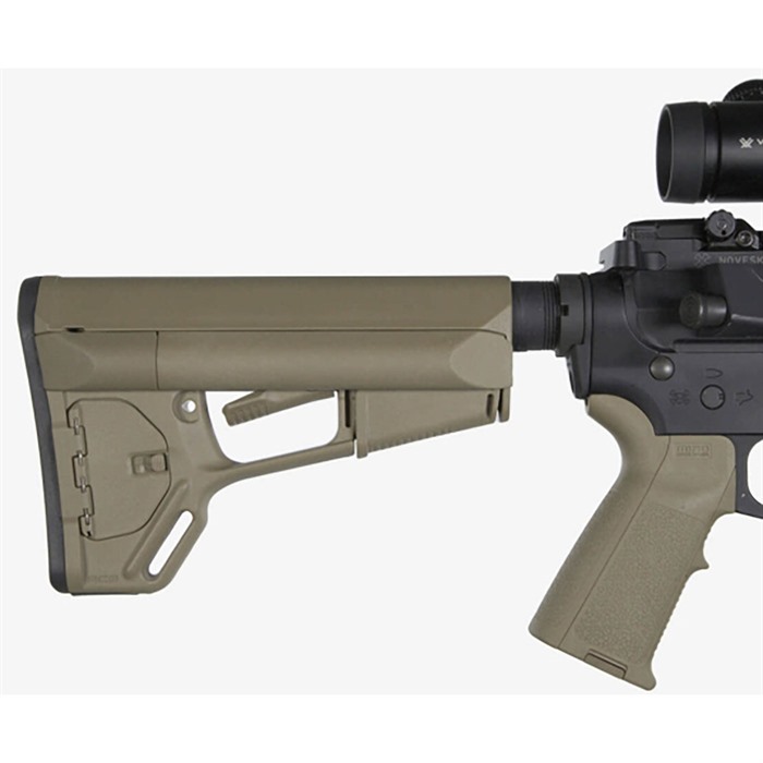 System podwójnego blokowania Magpul wykorzystuje dodatkowy dźwignię blokującą, aby chronić dźwignię zwalniającą przed przypadkowym uruchomieniem, a jednocześnie pozwala na regulację długości kolby poprzez proste naciśnięcie dźwigni zwalniającej. Wlot w końcówce kolby zapewnia punkt mocowania dla pasa o szerokości 1¼". Kolba zawiera również odczepianą gumową podkładkę, znaną z kolb Magpul CTR i UBR, co zapewnia pewne trzymanie kolby na ramieniu.