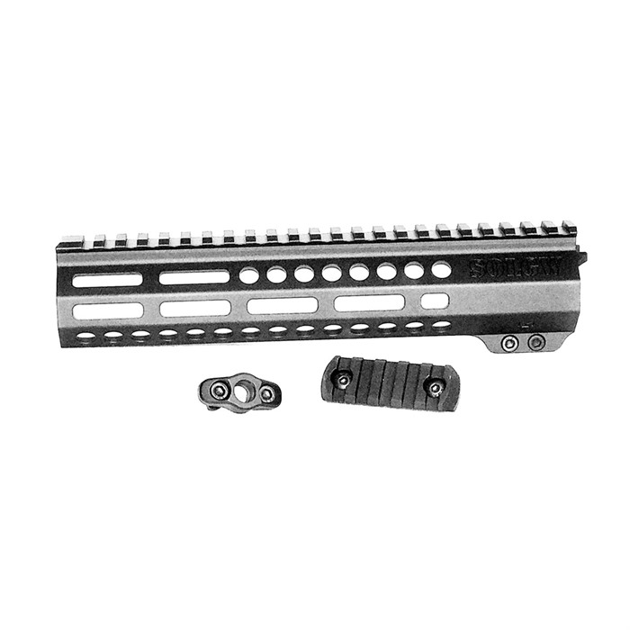 The new Sons of Liberty EXO2 Rail. A super tough new rail from Sons of Liberty, designed to meet demanding duty requirements while remaining light and affordable. The EXO-2 features MLOK at 1, 3 , 6, 9, & 11 o'clock and an aluminum Barrel Nut with Steel Hardware. Perfect for duty rifles and backed by a lifetime warranty. Includes an M-LOK QD Socket and 5 Slot Aluminum Rail Section. Available in a black finish with a 5” Rail Section. The Exo2 Rails come in 9.5”, 10.5”, and 15” lengths.