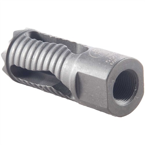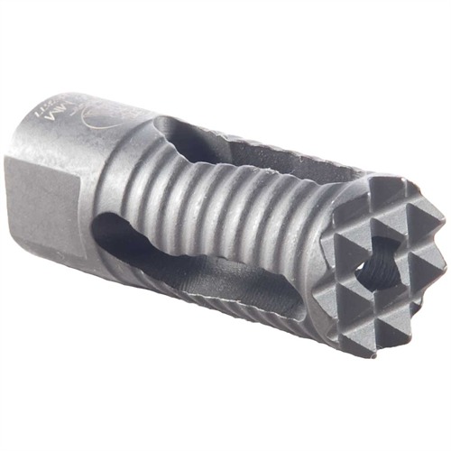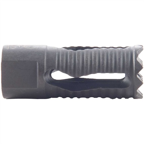 Muzzle attachments specifically designed to enhance your CQB effectiveness install on any AR-15 rifle or carbine with ½"-28 tpi muzzle threads. Aggressive, diamond-shaped teeth aid in effective less-lethal muzzle strikes during hand-to-hand combat, while wide strike face lessens danger of a penetrative wound on contact. Also serves as a stand-off device for body contact shots. Precision formed from 8620 steel, heat hardened to resist erosion by combustion gases, with a tough, parkerized finish that matches most black/dark gray rifle finishes. Muzzle Brake helps you stay on target by venting gases upward to counteract muzzle rise for fast follow-up shots; improves control and accuracy during full-auto fire. Accepts most over-the-barrel sound suppressors and actually increases their effectiveness.