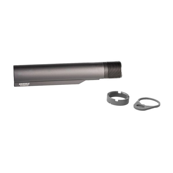 The Geissele Premium Mil-Spec Buffer Tube is machined from quality 7075-T6 Aluminum and finished in Type 3 Hardcoat Anodize. This rigid and durable buffer tube conforms to all mil-spec standards and features 6 stock positions. This carbine length and mil-spec diameter Premium Buffer Tube is made in the USA and weighs in at 3.7oz, making it the perfect fit for your AR-15 lower and ensuring compatibility with most mil-spec diameter quality AR-15 stocks. Included in the package is a high-quality, mil-spec castle nut and end plate.