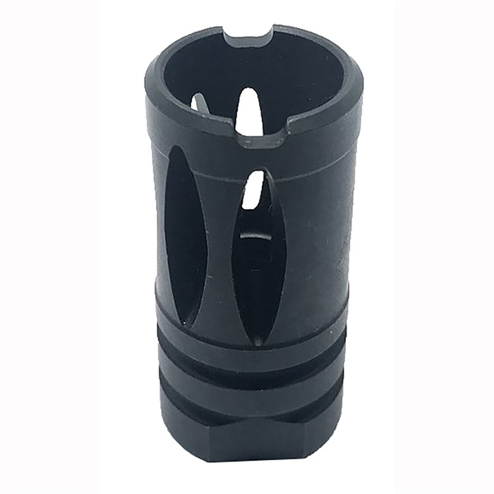 Threaded for 5/8x24, precision machined from solid 4140 bar stock, heat treated, and black nitrided, it is probably the finest A2 style comp/flash suppressor ever produced. Its 3 and 9 o'clock ports are 25% smaller (shorter and narrower) than the other three upward facing ports so more gas is vented through the upward facing ports, it is a superior compensator to the A2, its flash suppression is equal to that of an A2. 6315 is compatible with M16 BFA and most A2 mounted sound suppressors. Note that since 6315 does have flash suppression capability equal to that of an A2, it is to be treated as a flash suppressor for states that feel threatened by them, such as CA, MA and NY. Threaded for 5/8x24. 6310 is a light and short blended performance muzzle device. It features shorter and smaller 3 and 9 o'clock ports to direct gas upward, this provides 15 to 20% better muzzle rise compensation than the A2, and what is impressive is that it does so without sacrificing its flash suppression capabilities or creating more noise and concussion. The number 63 in its name pays homage to the Stoner 63 light machine gun, the shape of its ports draws heavily from the Stoner 63 LMG's flash suppressor design. A crush washer is included Proudly designed and made in USA. Compact A2 sized 5/8x24 threaded 30 cal flash suppressor/compensator Improved muzzle rise compensator capabilities