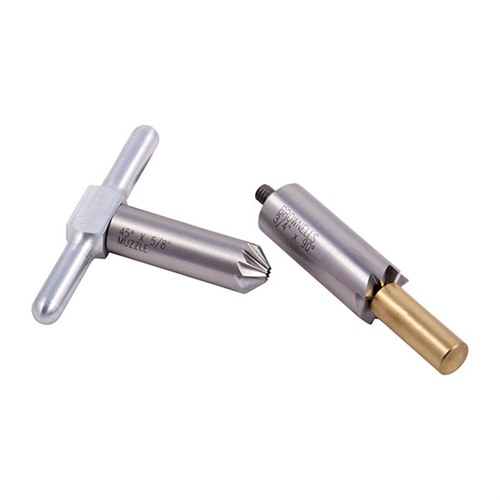 050806012813 Zestaw zawiera: jeden nożyk do frezowania 90° do prostowania wylotu po skróceniu lub naprawy uszkodzeń; jeden nożyk fazujący 45° do zaokrąglania krawędzi gwintu dla czystego wyjścia pocisku lub fazowania otworu cylindra rewolweru dla szybkiego ładowania; oraz jedną rączkę, która pasuje do każdego nożyka i jeden mosiężny pilot. Wymienny pilot utrzymuje nożyk w odpowiedniej pozycji. Zakup dodatkowych pilotów pozwala na użycie jednego nożyka do wielu różnych kalibrów. Piloty do innych kalibrów dostępne osobno.Zaległe, czas dostawy ok. 4-12 tygodnie z magazynu w USA.