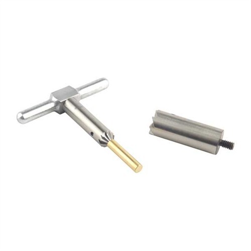 050806022546 Zestaw zawiera: jeden nożyk do frezowania 90° do prostowania wylotu po skróceniu lub naprawy uszkodzeń; jeden nożyk fazujący 45° do zaokrąglania krawędzi gwintu dla czystego wyjścia pocisku lub fazowania otworu cylindra rewolweru dla szybkiego ładowania; oraz jedną rączkę, która pasuje do każdego nożyka i jeden mosiężny pilot. Wymienny pilot utrzymuje nożyk w odpowiedniej pozycji. Zakup dodatkowych pilotów pozwala na użycie jednego nożyka do wielu różnych kalibrów. Piloty do innych kalibrów dostępne osobno.Zaległe, czas dostawy ok. 4-12 tygodnie z magazynu w USA.