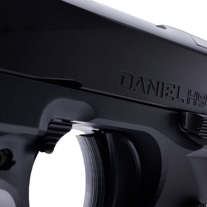 Get more control for faster, flatter shooting with the DANIEL H9. With the thinnest profile and lowest bore axis in its class, the DANIEL H9 is designed and engineered to make you a better shooter. While sharing the ergonomics, pointability, and straight-pull trigger with the classic 1911, the DANIEL H9 has all the features demanded of a modern striker-fired handgun. It features ambidextrous controls, accessory rail and is optics-ready. The aircraft-grade aluminum grip keeps the DANIEL H9 surprisingly lightweight and ensures the legendary durability you have come to expect from Daniel Defense—all built around a cold hammer forged barrel. It’s the future of defense—built in Black Creek, GA—by the most trusted name in firearms. FEATURES: Low Bore Axis For Less Muzzle Rise & Faster, More Accurate Follow-Up Shots Straight-Pullback Trigger & Trigger Safety Blade For Precision Control & Improved Safety One-Piece-Machined Ambidextrous Slide Stop & Reversible Mag-Release Button For Superior Ergonomics Cold Hammer Forged Barrel, 1:10 Twist, 6 Groove, Polygonal Rifling Type 7075 Aluminum Grip For Less Weight and More Strength Balanced-Texture Grip Panels For Comfort & Secure Purchase Compatible with Most Popular Red Dot Optics Slim Profile For Optimal Maneuverability & Concealability Steel Factory Sights With Dovetail Cut Low Friction Magazine Finish for Smooth Insertion/Removal SPECIFICATIONS: Model - DANIEL H9 Caliber - 9X19MM Action - Striker-Fired, Reciprocating Slide, Tilting Barrel Magazine Capacity - 15 Rounds Barrel Length - 4.28" Overall Length - 7.69" Overall Height - 5.12" Overall Width - 1.2" (Slide Stops) Slide Width - 1.0" Weight - 29.6 oz. (Unloaded Magazine) Accessory Rail - STANAG 4694 Sights - Fixed: Fiber Optic Front, Black-Out Rear – U-Notch Safety Devices - Trigger Safety Blade, Trigger Safety Plunger, Striker Block Trigger Type - Metal Construction, Straight Pull w/Integral Safety Blade