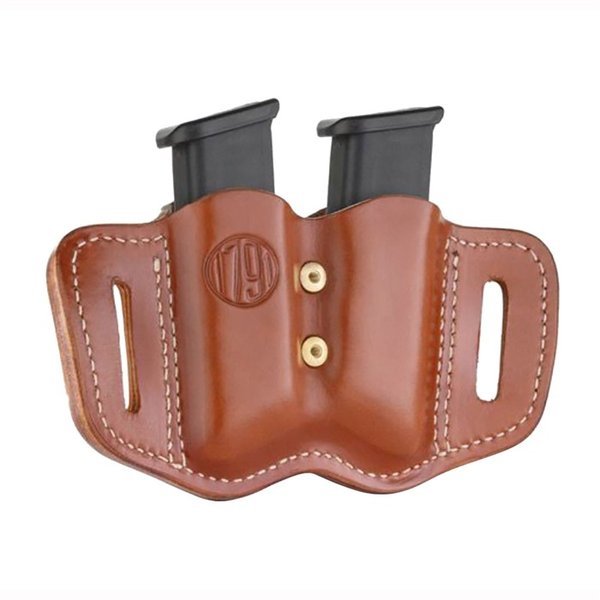 Kabura na magazynki podwójne dla magazynków typu Single Stack, wykonana z certyfikowanej amerykańskiej ciężkiej skóry bydlęcej, nie wymaga dodatkowych urządzeń zabezpieczających, a otwarta konstrukcja umożliwia szybki dostęp do zapasowych magazynków.