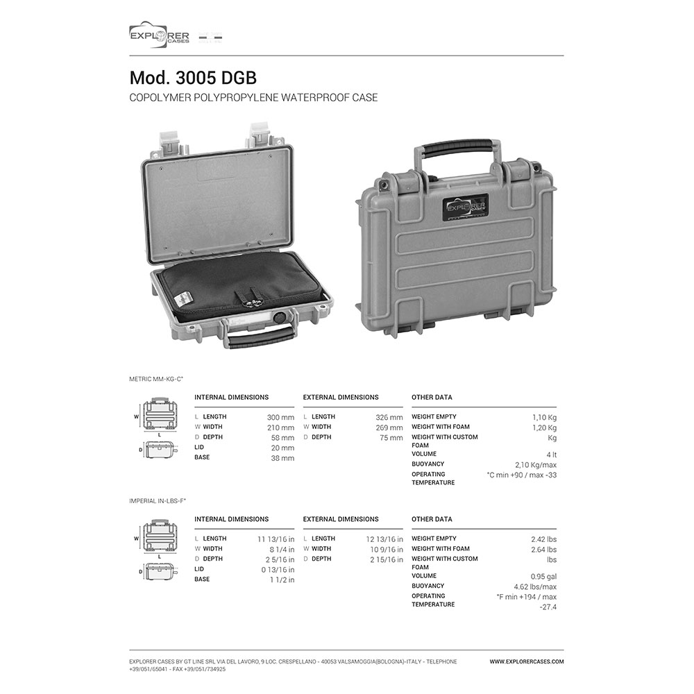 8024482183503 Najlepsza ochrona dla twojego najcenniejszego skarbu - Ostateczna torba na broń z różnorodnymi funkcjami w najwyższej jakości, wyprodukowana przez Explorer Cases we Włoszech. Dane techniczne: Długość: 326mm (300mm wewnątrz) Szerokość: 269mm (210mm wewnątrz) Głębokość: 75mm (58mm wewnątrz) Waga: 1,20kg (1,10kg waga pusta bez wkładu) Kolor: Czarny Wkład: w zestawie z torbą na broń Dosłownie niezniszczalna Torby na broń od Explorer Cases mają korozjoodporne metalowe zawiasy z funkcją zatrzymania pokrywy, które stabilizują pokrywę i utrzymują ją w miejscu po otwarciu. Możesz być pewien, że twoje torby na broń będą ci służyć przez długi czas. Dzięki zamkom zabezpieczającym torby na broń są zawsze wysoko zabezpieczone. Uszczelka O-ring sprawia, że są one w dużym stopniu odporne na wodę. Każda torba na broń jest wyposażona w ręczny zawór do uwalniania ciśnienia powietrza. Dzięki temu możesz być spokojny i nie będziesz miał problemów z obsługą i zamykaniem torby. Dokładnie tak, jak chcesz Torby są wyposażone w wewnętrzne wycięcia na opcjonalne wewnętrzne uchwyty lub pierścienie montażowe, dzięki czemu możesz przechowywać wszystko dokładnie tak, jak jest to najbardziej odpowiednie dla twoich potrzeb. Każda torba posiada wodoodporną, wymienną etykietę, dzięki której możesz oznaczyć swój sprzęt lub przechować swoje dane. Torba może być transportowana tradycyjnie za pomocą dużego uchwytu z przodu lub za pomocą opcjonalnych pasków na ramię, które można łatwo przymocować do dowolnego modelu. Seria 3005 jest zoptymalizowana do transportu samolotem.Czas dostawy ok. 3-6 dni.