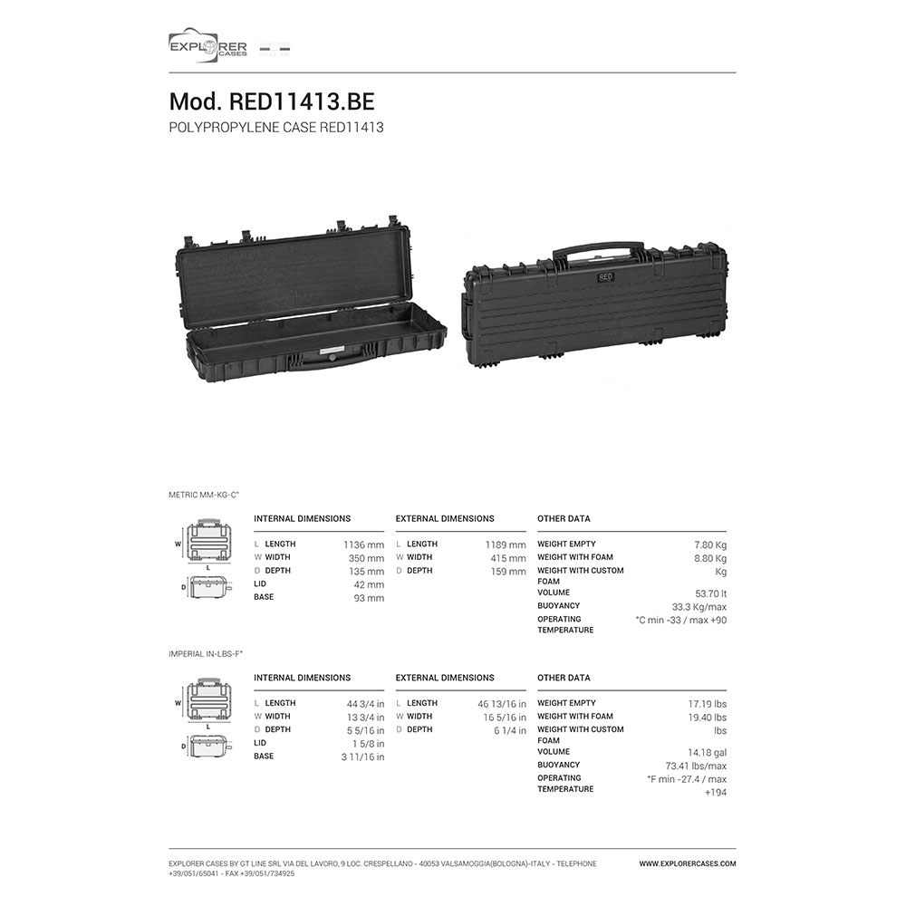 8024482182865 Najlepsza ochrona dla Twojego najcenniejszego dziecka - Ostateczna torba na broń z różnorodnymi funkcjami w najwyższej jakości, wyprodukowana przez Explorer Cases we Włoszech. Specyfikacje: Długość: 1189mm (1136mm wewnątrz) Szerokość: 415mm (350mm wewnątrz) Głębokość: 159mm (135mm wewnątrz) Waga: 7,80kg Kolor : Czarny Dosłownie niezniszczalna Torby na broń od Explorer Cases mają korozoodporne metalowe zawiasy z funkcją zatrzymywania pokrywy, które stabilizują pokrywę i trzymają ją na miejscu po otwarciu. Możesz być pewien, że Twoje torby na broń będą Ci służyć przez długi, długi czas. Dzięki zapięciom na zamki torby na broń są zawsze wysoko zabezpieczone. Uszczelka O-ring sprawia, że są one w dużym stopniu wodoodporne. Każda torba na broń jest wyposażona w ręczny zawór do uwalniania ciśnienia powietrza. Dlatego możesz być spokojny i nie będziesz miał problemów z obsługą i zamykaniem torby. Dokładnie tak, jak chcesz Torby są wyposażone w wewnętrzne wycięcia na opcjonalne wewnętrzne uchwyty lub pierścienie montażowe, dzięki czemu możesz przechowywać wszystko dokładnie tak, jak najbardziej odpowiada Twoim wymaganiom. Każda torba posiada wodoodporną, wymienną etykietę, dzięki której możesz oznaczyć swój sprzęt lub przechować swoje dane. Torba może być transportowana tradycyjnie za pomocą dużego uchwytu z przodu lub za pomocą opcjonalnych pasków na ramię, które można łatwo przymocować do każdego modelu. Seria Mod Red 11413 może być również używana jako torba na kółkach.Usunięto z programu