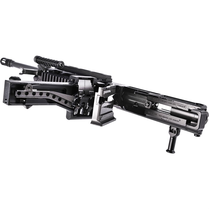 - Podwójne zasilanie: Akceptuje magazynki 4179 STANAG oraz amunicję M27 w łańcuchach