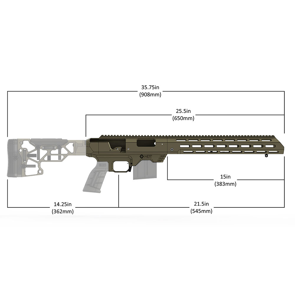 TAC21 Gen 2 Chassis System uses AICS-type magazines and AR-type pistol grips, receiver extensions/buffer tubes and buttstocks(sold separately). The easiest and usually best way to complete this chassis is to purchase MDT's AR Pistol Grip and Skeleton RIfle Stock, and of course at least one magazine for your action and caliber. You will get benchrest accuracy, superior ergonomics, versatility and modularity. Straight-line desing means that the recoil comes straight back and does not raise the barrel, which translates to less felt recoil, quicker follow-up shots and better accuracy. Because of this design, the chassis comes in 4 pieces, with all required mounting hardware. Installing can be done in less than an hour, and no bedding is needed.