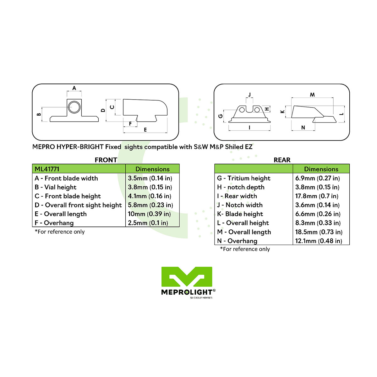 The Mepro HYPER-BRIGHT fixed Day and Night Sights provide the most reliable illumination day or night. Mepro HYPER-BRIGHT fixed sights feature an extremely bright contrast colored ring for fast accurate target acquisition in the daytime. Both rear and front tritium sources will appear green during lowlight and no light scenarios providing the upmost confidence in their ability to make hits when it counts.