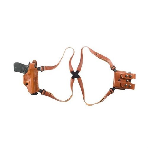 A key component of this shoulder system is its spider harness. All four points of the spider harness pivot independently and are connected by our unique clover shaped Flexalon™ swivel back plate, which is a Galco trademark. This results in a perfect fit and lasting comfort for all sizes and shapes. This system is constructed of premium saddle leather and includes holster, harness, ammo carrier and a set of system screws. The Miami Classic is fully modular. Harness fits chests to 52". Note: Holster system pictured with magazine carrier for semi-auto. Revolver systems include double drop pouch for loose cartridges.