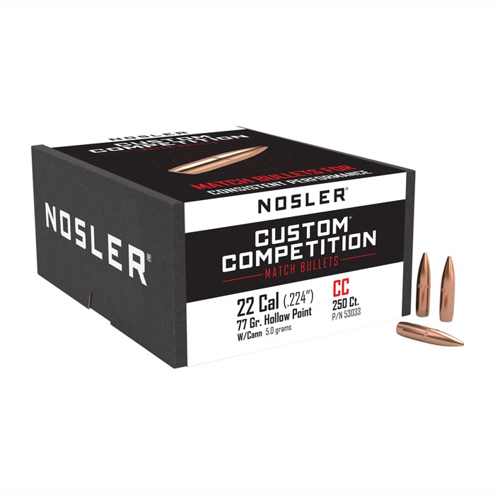 CUSTOM COMPETITION 22 CALIBER (0.224") HOLLOW POINT BOAT TAIL RIFLE BULLETS Blending the accuracy of Nosler Custom Competition bullet jackets with our own ultra-precise, lead-alloy cores, we’ve created one of the most accurate match rifle bullets on the market. The hollow point provides a small meplat for reduced drag and increased aerodynamic efficiency while the pronounced boat-tail design provides exceptional flight characteristics over a wide range of velocities. Engineered to exhibit unmatched accuracy, the custom quality jacket form-fits the lead-alloy core for maximum bullet stability and balance. Hand-inspected for quality assurance, Nosler Custom Competition bullets rival all others on the range. FEATURES: Hollow Point Custom Quality Jacket Form-Fitted, Lead-Alloy Core Pronounced Boat-Tail Design