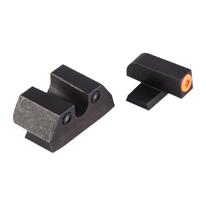 Perfect Dot night sights for SIG Sauer P-series pistols from Night Fision use proven Tritium illumination technology in the front sight with a plus: 30% more Tritium for a much brighter, easier-to-locate dot! Paired with a plain black rear sight, the ultra-bright front sight grabs the eye’s attention, encouraging instinctive "Front Sight Focus," so your eyes stay on the target. The Tritium insert isn’t surrounded by a painted-on ring, but rather one made of a daylight fluorescing material that produces optimum visibility in daylight. The Night Fision folks call it the "Perfect Dot," which provides maximum visibility in both nighttime AND daylight conditions. When the pressure is on, you’ll locate your SIG’s sights quickly - and get them on target fast. Variety of front dot colors & rear notch configurations to choose from (see below) Rugged machined 4140 steel sight bodies - far stronger than the factory plastic Tough black Nitride finish for outstanding wear- and corrosion-resistance Tritium vial has extra protection from knocks & dings Sold as front/rear pairs only Night Fision Perfect Dot night sights for SIG Sauer P-series pistols are available in two sizes, one to fit in SIGs chambered in 9mm Luger (9x19mm) / .357 SIG, the other for the .40 S&W / .45 ACP chambered P-series. Options include a choice of Square or U-shaped rear notch on the plain black rear sight, with a choice of Orange or Yellow outline around the Tritium front dot. You can fit your SIG with a "Perfect Dot" night sight configuration that’s perfect for your needs.