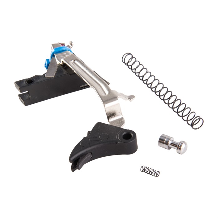 Zestaw Zev Technologies Pro Curved Trigger Drop-In dla GLOCK Gen 1-3 zawiera: spust, blok spustowy, wyrzutnik, łącznik, sprężynę spustową oraz lekką stalową zapadkę bezpieczeństwa i sprężynę, aby jeszcze bardziej udoskonalić pociągnięcie spustu. Zestaw zawiera sprężynę uderzeniową o zmniejszonej mocy, aby uzyskać lżejsze odczucie spustu do zawodów, oraz fabryczną sprężynę uderzeniową do codziennego noszenia i użytkowania.