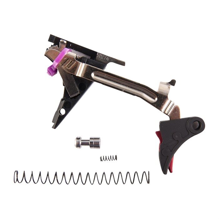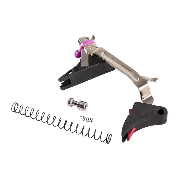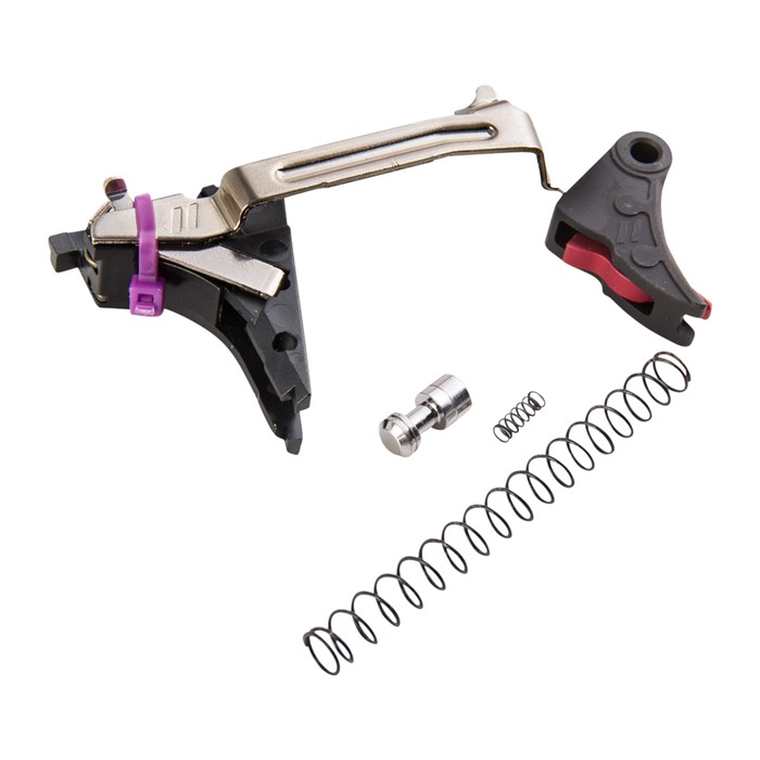 Eliminate that “mushy” factory trigger feel with the drop-in ready, Zev Technologies Pro Curved Trigger Drop-In Kit for the Glock® Gen 4 and enjoy reduced trigger travel, plus a crisp, clean pull with a glass like break. Zev’s proprietary trigger bar and professional connector are engineered to give you a consistent, positive reset, with a reduction in trigger pull weight, yet still retain the pistol’s renowned reliability and safety. Rounding out the kit’s accoutrements is a wide trigger pad and wide safety to give you better purchase for improved control with less fatigue - especially on those long training sessions. Trigger pad uses a revolutionary riveted assembly process that makes it one of the longest lasting, most reliable replacement triggers on the market. Improved geometry for lightened trigger pull with crisp, positive reset Ergonomically correct trigger pad Mil-spec hard-anodized aluminum construction Included in the Zev Technologies Pro Face Trigger Drop-In Kit for the Glock Gen 4 are: trigger, trigger bar, trigger block, ejector, connector, trigger spring, and a lightweight stainless steel firing pin safety plunger and spring to further refine the trigger pull. Comes with a reduced-power striker spring to produce a lighter-feeling trigger for competition, and the factory-weight striker spring for daily carry and duty use.