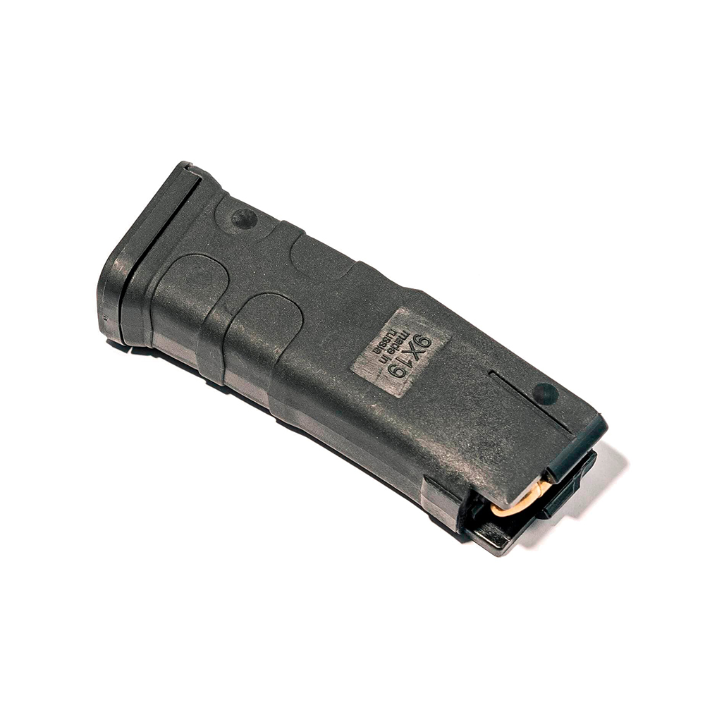 Magazynek charakteryzuje się szorstką powierzchnią oraz zewnętrznymi ściankami pokrytymi wzorem bieżnika, co zapewnia pewny chwyt i zapobiega ślizganiu się w dłoniach. Dodatkowo, demontaż magazynka jest prosty i szybki.