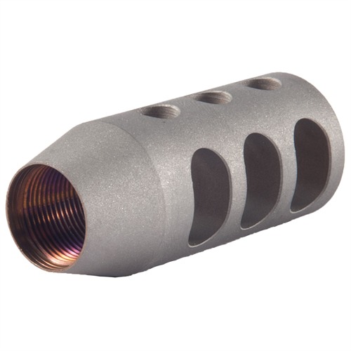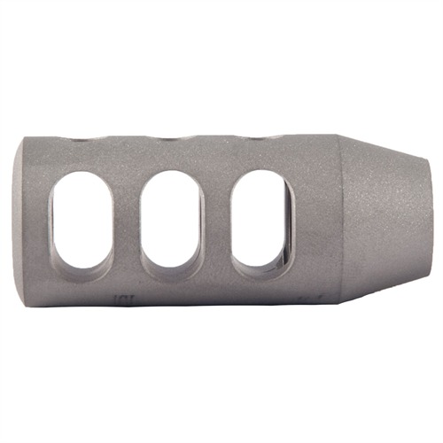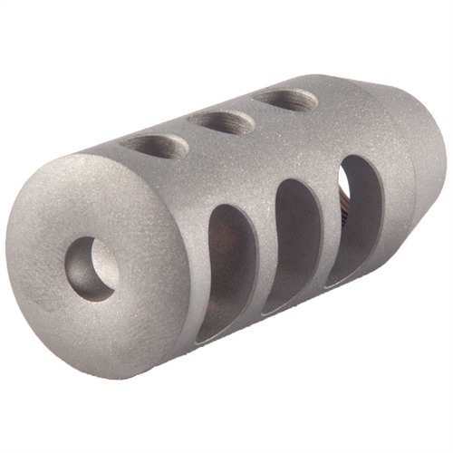 Three expansion chambers provide up to 45% measured reduction in felt recoil. Triple baffle, exhaust slots redirect noise and muzzle blast away from the shooter. Gives high volume shooters a quiet sounding brake that's easy to clean. Closed bottom keeps exiting gas from blowing up dirt and debris. Tapered shank for easier fitting to different barrel diameters. Adds 1-1/4" to barrel length. Comes with a thread protector.