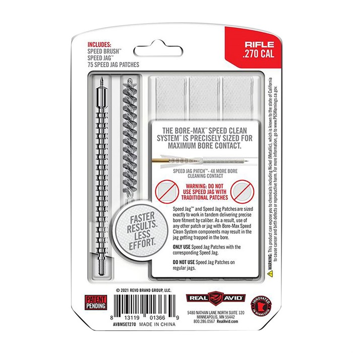 Konfiguracja włosia szczotki Bore-Max Speed zapewnia maksymalną gęstość szorowania, jednocześnie zachowując wystarczającą elastyczność, aby skutecznie dotrzeć do bruzd i rowków. Wydłużony Speed Jag posiada wiele pierścieni kompresyjnych wzdłuż całej długości. Bore-Max Speed Jag i Patches są precyzyjnie dopasowane, aby zapewnić optymalną kompresję i kontakt z wewnętrzną powierzchnią lufy.