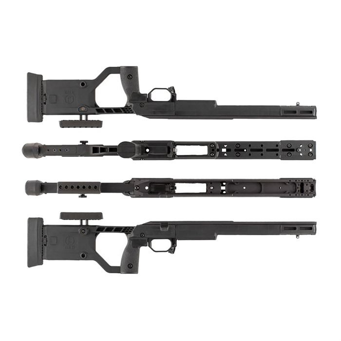 X-Ray Chassis (Generation 4) Unprecedented value...This is what the X-Ray chassis provides to you. When you pick up the X-Ray, it will feel nice and light compared to other chassis. You'll have nearly identical ergonomics to the Whiskey-3 with only a little more time involved in adjusting the different aspects like the length of pull. Furthermore, you'll have all the standard benefits of a chassis like the use of AICS magazines, a variety of mounting points for slings, barrier stops, etc., and aluminum block bedding for the action while not having to sell off a kidney to pay the price of admission. To accomplish Kinetic Research Group’s design intent, we kept the features that everyone wants and needs and eliminated those that weren't necessary. Then they utilized efficient manufacturing processes to keep production costs down and in turn keep the price to the shooter down. The end result is a hybrid aluminum and polymer chassis that we think you'll love. Kinetic Research Group is proud to present the X-Ray chassis, the result of years of careful design, thought, refinement, and hard work. The change is a new one piece backend, which comes standard with tool-less buttpad height and cant adjustment, as well as a ambidextrous cheekpiece thumbscrew. All KRG’s chassis take AICS magazines with nothing extra needed, the magazine is not included. Note: Actions with trigger hangers will not work without mods to the chassis, hanger, or both.