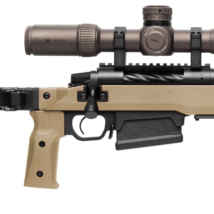 Uchwyt z wtryskiwanego polimeru z 5-stopniowym nachyleniem krawędzi do przodu i powiększoną rękojeścią z 7-stopniowym nachyleniem krawędzi do tyłu dla zwiększonego komfortu użytkownika, w połączeniu z zakresem regulacji przód/tył wynoszącym 0.75”, używając powszechnego klucza sześciokątnego. Dodatkowa opcja uchwytu z bardziej agresywnym nachyleniem i powiększoną rękojeścią dla strzelca, który preferuje mniej pionowy interfejs uchwytu (8 stopni do przodu / 20 stopni do tyłu).