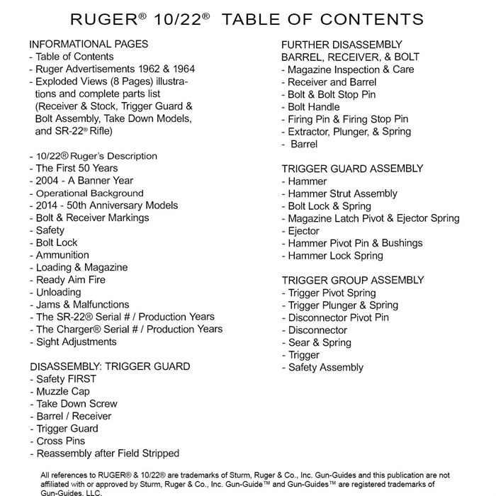 Podręcznik jest spiralnie związany, co umożliwia łatwe otwarcie na stole warsztatowym. Obejmuje 67 stron, wymiary 5-1/2” x 8-1/2” oraz 106 zdjęć. Przewodnik obejmuje wszystkie modele wyprodukowane od 1964 do 2015 roku, w tym Carbine, Rifle, International, Takedown®, SR-22® oraz ChargerTM. Dodatkowo zawiera pełną listę numerów seryjnych od 1964 do 2014 roku.