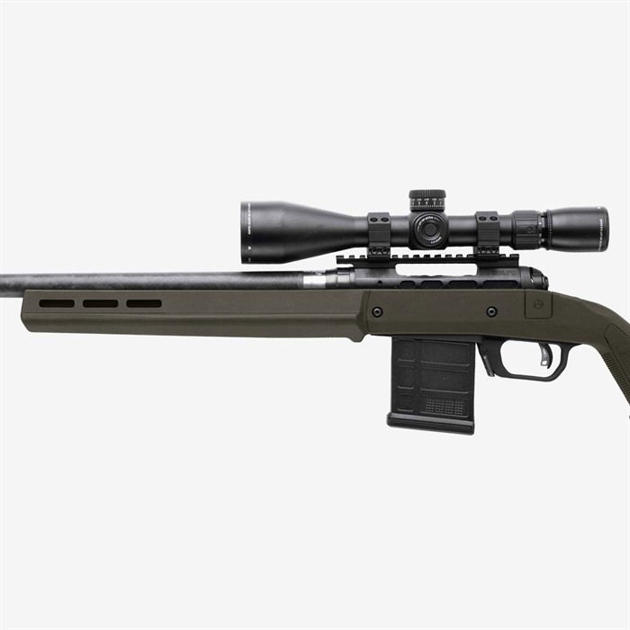 The Hunter 110 Stock – Savage 110 Short Action is the latest addition to the Magpul Hunter stock product line. It features enhanced ergonomics, versions for both right and left-hand actions, eight M-LOK® slots for mounting options, and a fully adjustable length of pull and comb height. These features have been optimally designed to provide a more stable shooting platform, improved user comfort and individual accessory customization. Like its predecessors, the Magpul Hunter 110 features a Type III hard anodized, machine-finished, cast aluminum bedding block that doesn’t require bedding and is a true “drop-in” stock solution. The Hunter 110 is designed for 3rd generation Savage short action Series 10/110 centerfire rifles that have center-feed magazine compatibility and action screw hole spacing of 4.40” (H-prefix and later) with production a date of 2006 and later. The Hunter 110 also includes Magpul’s Bolt Action Magazine Well for optimal functionality with AICS-spec detachable box magazines such as Magpul’s PMAG® 5 7.62 AC (sold separately). FEATURES Reinforced polymer shell with Type III hard anodized, machine finished, A380 cast aluminum V-bedding block. Available for right and left hand actions. Provides AICS-spec magazine compatibility for optimal performance and reliability (magazines sold separately) Made in the USA. SPECS Collection: Hunting Stocks Platform: Savage® 110 Butt-Pad Dimensions: 1.5 in W x 5.0 in H LOP Adjustment Range: 13.0 in, - 15.0 in. (13 in. with no spacers plus up to four half-inch spacers) Weight: 3.3 lbs. Width of Butt, max: 1.5 in. Width of Forend, max: 2.3 in. Compatible with 3rd generation Savage short action Series 10/110 centerfire rifles with center-feed magazine compatibility and action screw hole spacing of 4.40” that began in 2006. Compatible with barrel profiles up to Medium Palma and Savage Varmint barrel contours. Tapered Beam design provides rigidity through the forend and will free-float compatible barrels. Push-button QD swivel compatibility with optional Sling Mount Kits in rear of stock.