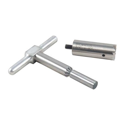 050806017535 Zestaw zawiera: jedno narzędzie tnące 90° do prostowania wylotu po skróceniu lub naprawy uszkodzeń; jedno narzędzie do chamferowania 45° do łagodzenia krawędzi gwintu dla czystego wyjścia pocisku lub chamferowania wylotu bębna rewolweru dla szybkich przeładowań; oraz jeden uchwyt pasujący do obu narzędzi oraz jeden stalowy pilot. Wymienny pilot utrzymuje narzędzie w prawidłowej pozycji. Zakup dodatkowych pilotów pozwala używać jednego narzędzia do wielu różnych kalibrów. Piloty do innych kalibrów dostępne osobno.Zaległe, czas dostawy ok. 4-12 tygodnie z magazynu w USA.
