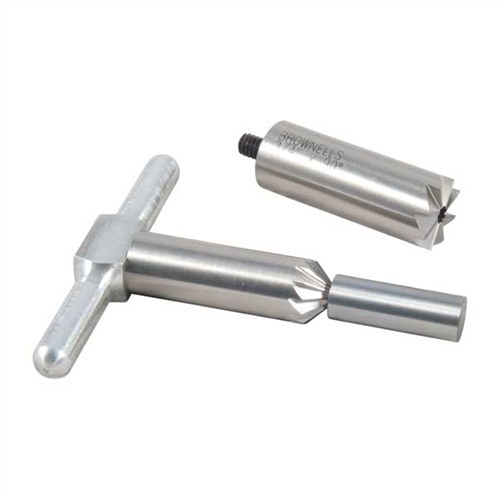 050806018662 Zestaw zawiera: jedno narzędzie tnące 90° do prostowania wylotu po skróceniu lub naprawy uszkodzeń; jedno narzędzie do chamferowania 45° do łagodzenia krawędzi gwintu dla czystego wyjścia pocisku lub chamferowania wylotu bębna rewolweru dla szybkich przeładowań; oraz jeden uchwyt pasujący do obu narzędzi oraz jeden stalowy pilot. Wymienny pilot utrzymuje narzędzie w prawidłowej pozycji. Zakup dodatkowych pilotów pozwala używać jednego narzędzia do wielu różnych kalibrów. Piloty do innych kalibrów dostępne osobno.Zaległe, czas dostawy ok. 4-12 tygodnie z magazynu w USA.
