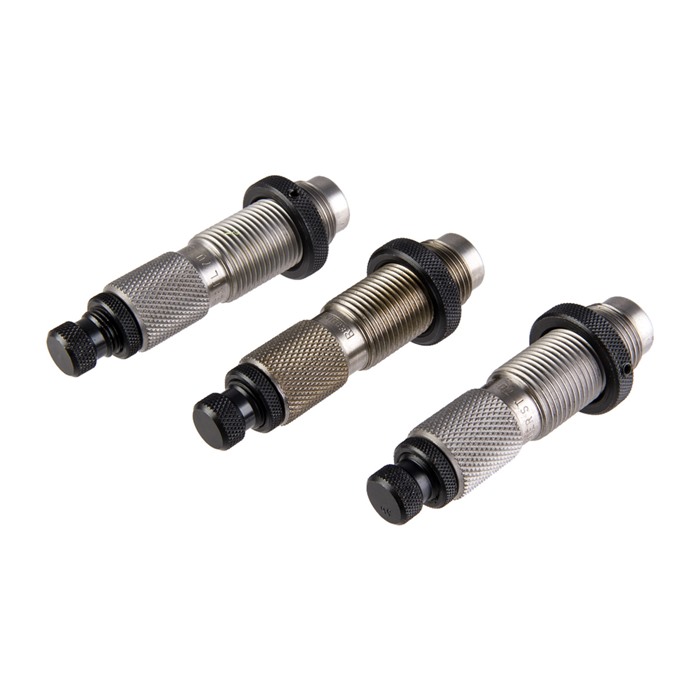 Zestaw die'ów Redding do łusek o prostych ściankach zawiera trzy die'y, co jest niezbędne, ponieważ nie można wykonać pełnego wymiaru łusek o prostych ściankach oraz rozszerzenia szyjki dla prawidłowego dopasowania pocisku w jednej operacji.