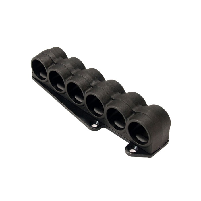 SPECS: Injection molded from glass filled polymer, lightweight aluminum backplate, matte black. For 12 gauge only. All models include mounting hardware, rubber gasket, and installation instructions. Right Hand models only. Remington Sidemount fits models 870/1100/11-87 (may require modification to gun). Rem 6-Round Sidemount – 6¼” (15.8cm) long x 1½” high. 5.4 oz. (152g) wt. Rem 8-Round Sidemount – 7¾” (19.7) long x 1½” high. 7 oz. (200g) wt. Remington Picatinny fits models 870/1100/11-87 (may require modification to gun). 7” (15.8cm) long x 2½” (6.3cm) high. 7.6 oz. (215g) wt. Mossberg fits models 500/590. 6-round ony. 6-3⁄8" (16.2cm) long x 1-3⁄8" (3.5cm) high. 5.2 oz. (147g) wt.Benelli Sidemount fits M1/M2/M3. Benelli 6-Round Sidemount – 6” (15.2cm) long x 2½” high. 6.3 oz. (179g) wt. Benelli Picatinny available for M2 (requires drilling tapping receiver to fit M1), M4/M1014, and Supernova. Benelli M2 6-Round Picatinny – 6” long x 2 (5.1cm)” high. 7.4 oz. (210g) wt. Benelli M4/M1014 6-Round Picatinny – 6” long x 2” (5.1cm) high. 7.5 oz. (213g) wt.
