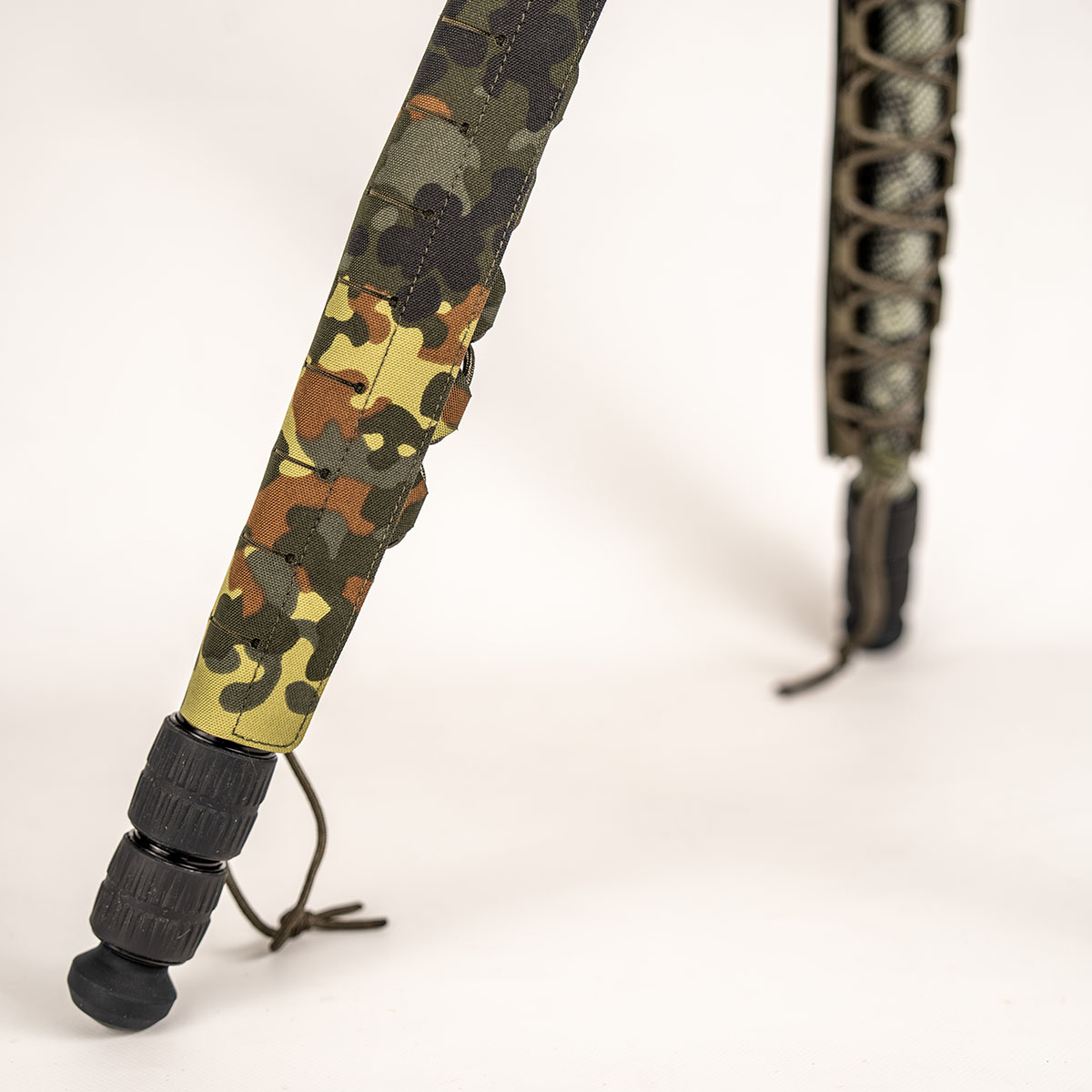 726529841916 The GTS Tripod Camo Leg Wraps are designed for shooters who want maximum concealment without limiting the functionality of their tripod. Unlike compact covers, these wraps are built as full-length camouflage nets that can cover the entire tripod leg - even when fully extended. Each wrap is made from lightweight, structured camouflage mesh that breaks up the straight lines and technical appearance of the tripod. This helps reduce visual signature in hunting and professional field environments, where hard edges and reflective surfaces can stand out against natural terrain. The wraps are secured in place using durable elastic cords, ensuring a tight and reliable fit along the full length of the leg. Once installed, they remain stable during movement and position changes without interfering with leg adjustment or overall tripod performance. In addition to camouflage, the netting also provides a light protective layer against scratches and minor abrasion, while maintaining minimal added weight. The breathable material prevents moisture buildup and dries quickly after exposure to rain or damp vegetation. The GTS Tripod Camo Leg Wraps are available in Flecktarn and Stone Grey Olive, allowing you to adapt your tripod to different environments and operational requirements. Full coverage. Reduced signature. No compromise on function.