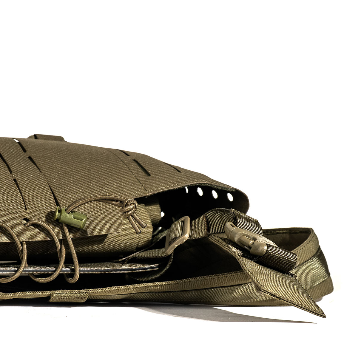 Poza transportem, Field Rig rozkłada się w funkcjonalną matę strzelecką. Po rozłożeniu zapewnia czystą i trwałą powierzchnię dla pozycji leżących, chroniąc zarówno strzelca, jak i sprzęt przed wilgocią, brudem i trudnym terenem. Ta podwójna funkcjonalność eliminuje potrzebę noszenia oddzielnego sprzętu, redukując ogólny ładunek przy jednoczesnym zwiększeniu efektywności.