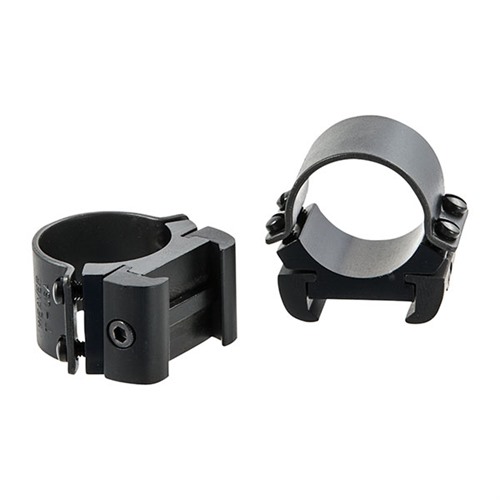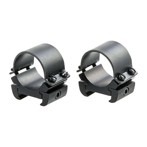 SPECS: Aluminum lower; steel cap, 4 screws, windage adjustment clamps. Allen wrench included. Black, gloss or matte finish. 1" (2.5cm) diameter. Heights measured from top of base to bottom of ring. Med., .180" (.5cm); High, .350" (.8cm); X-High, .575" (1.5cm).
