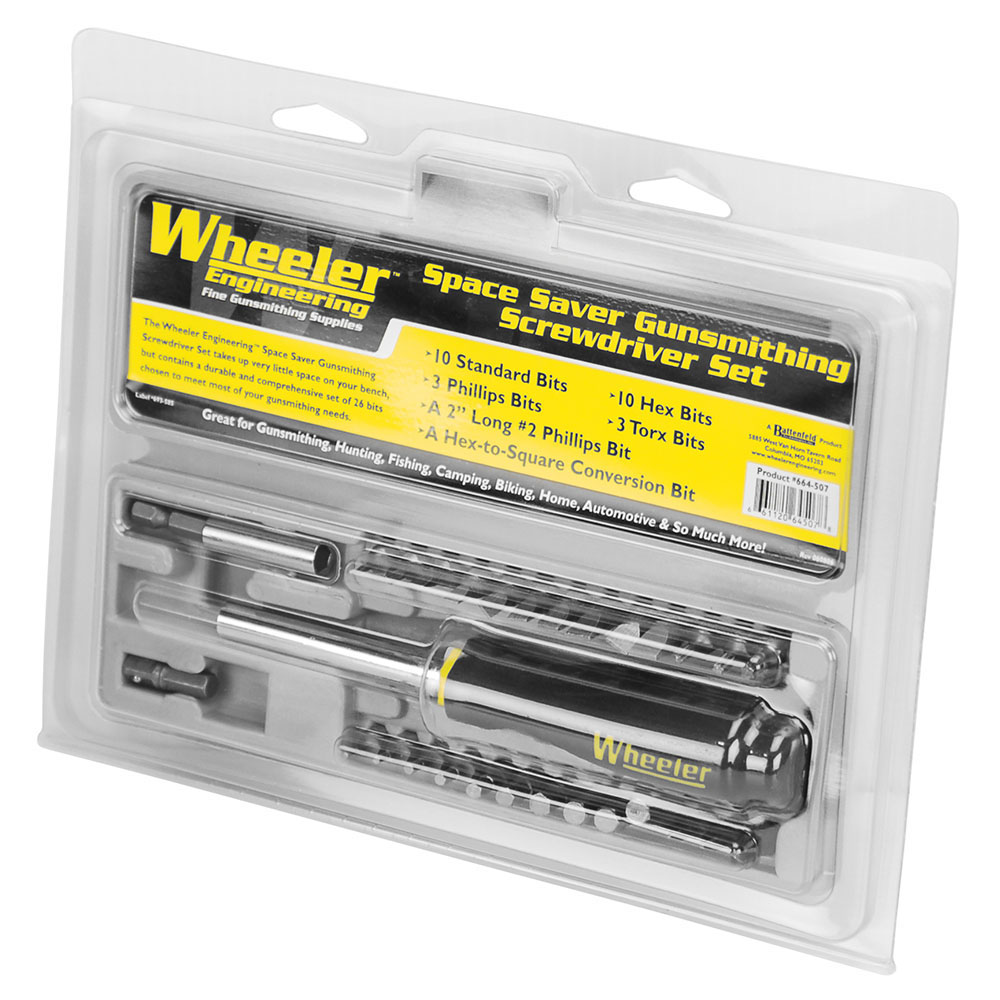 Wkrętak Wheeler® Space Saver Gunsmithing Screwdriver Set zajmuje mniej niż połowę miejsca w porównaniu do innych zestawów wkrętaków dla rusznikarzy, a mimo to zawiera trwały i kompleksowy zestaw 26 bitów, które spełnią większość Twoich potrzeb rusznikarskich. Jest to również idealny rozmiar do zabrania ze sobą na strzelnicę i w teren.