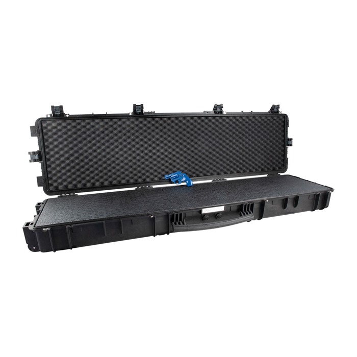 Finally, there's an extra-durable rifle case that's sized right for your extra-long precision rifle! For years, owners of these large, bulky, big-bore precision guns had to break their firearms down just to fit them into a travel case. With the Explorer X-Long Sniper Rifle Case, now these rifle owners have a travel-ready, hard-sided gun case with 60 inches of interior length that can accommodate the largest rifles on the market! Each Explorer X-Long Sniper Rifle Case is constructed from durable polypropylene material, which is strengthened, reinforced and sealed well enough to isolate and protect contents through harsh field conditions or particularly punishing travel experiences. The cases are waterproof, dustproof, sandproof, shockproof and crushproof. Designed particularly for military use, the cases are equipped with four steel-reinforced padlock points and feature multiple handles for easy carrying. This extra-long sniper-rifle case features heavy-duty wheels complete with ball-bearing internals, which allows it to be rolled by a single person with ease. Side handles also offer lift points for two individuals, if needed. The empty weight of the case is 23.6 pounds, and large rifles like the McMillan TAC 50, Barrett M82A1 and Barrett M107A1 are all easily accommodated inside this carry case.